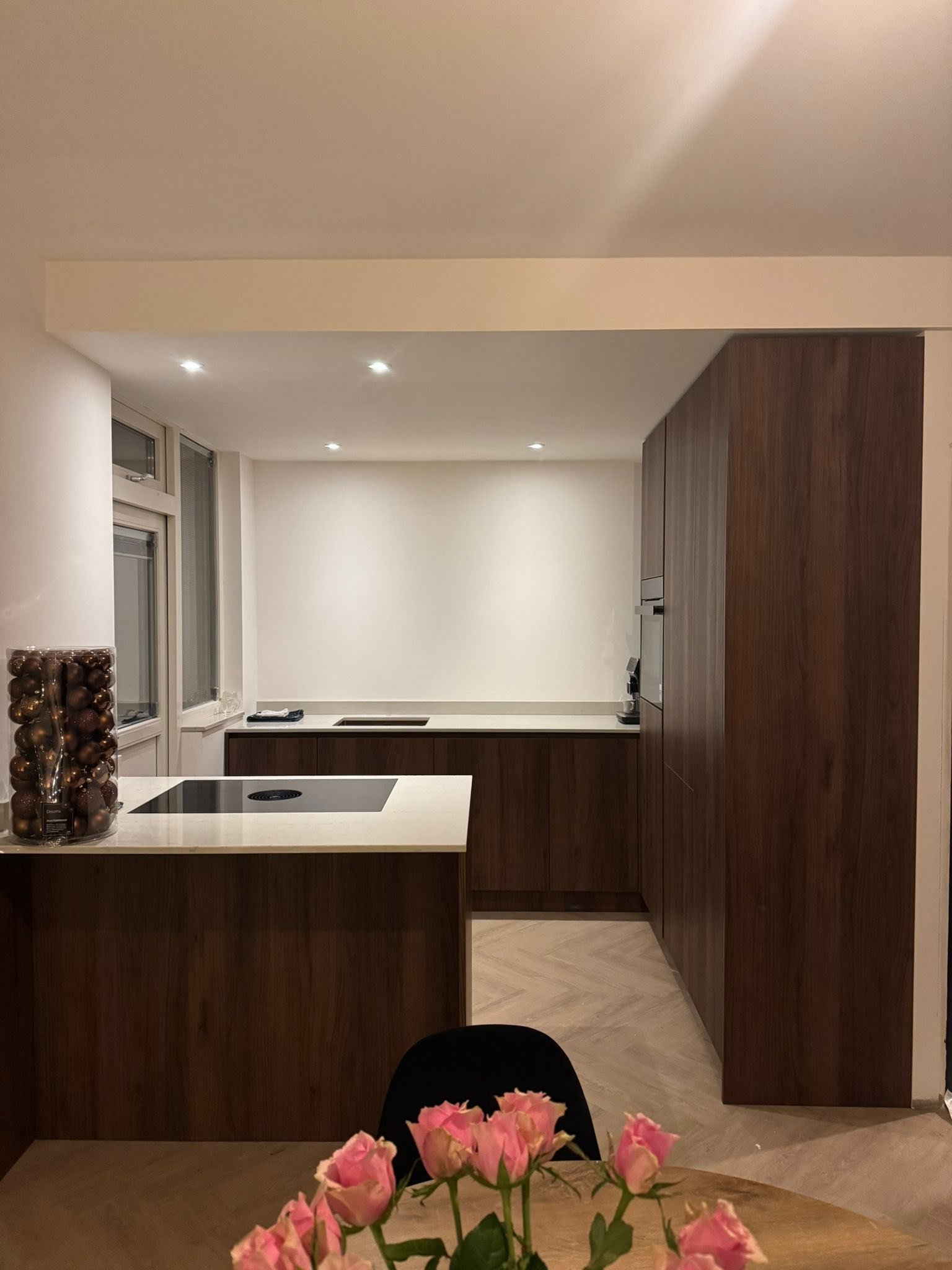 Een warme, moderne keuken die precies past bij de ruimte en de wensen van de klant.