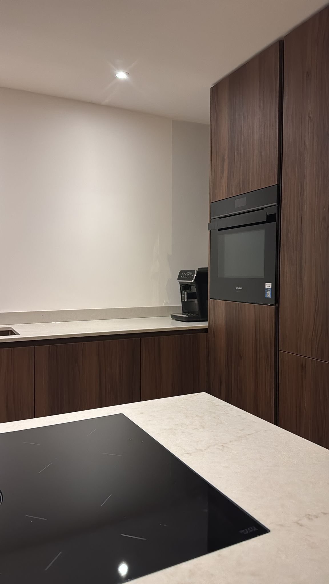 Deze prachtige keuken is een mooi totaalplaatje geworden. De fronten zijn gemaakt van notenhout en het blad is uitgevoerd in Prexory Sand. De onderbouw spoelbak en de vlakinbouw Bora kookplaat zorgen voor een strakke, rustige afwerking.