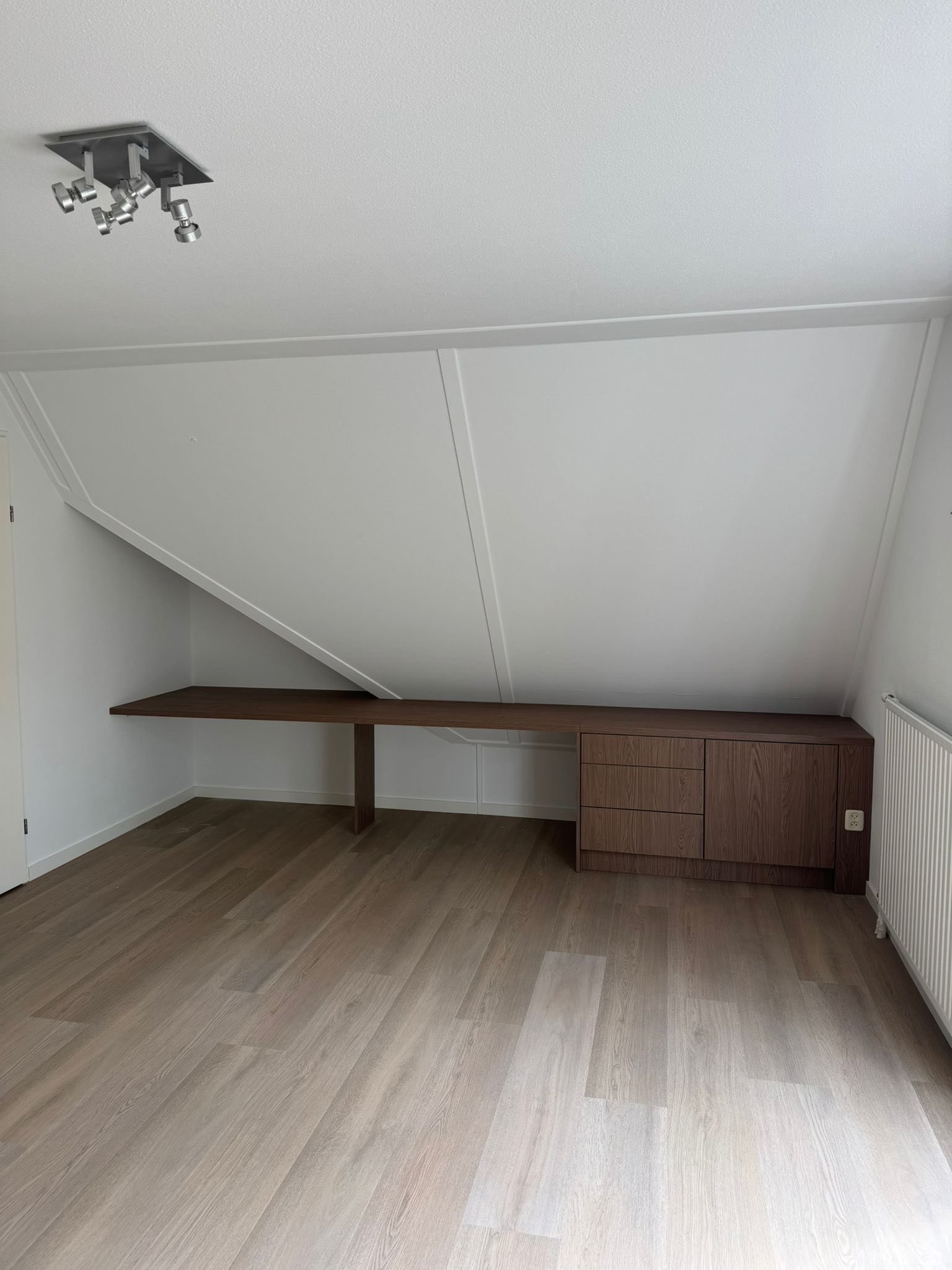 Daarnaast maakten we een bureau op maat dat precies onder het schuine dak past. Alles is rustig, strak en handig ingericht, zodat de klant het dagelijks met plezier gebruikt.