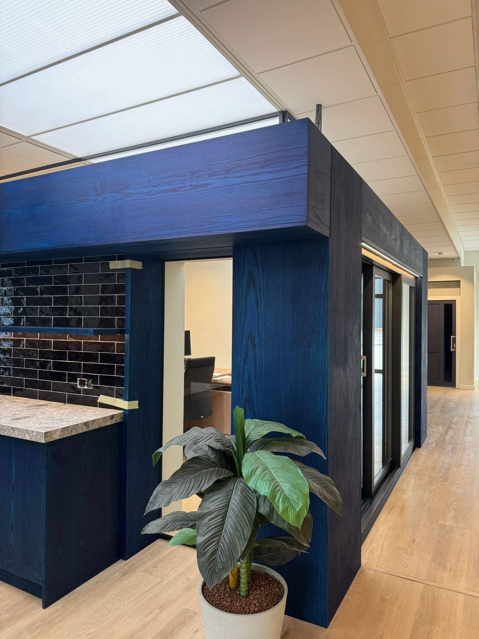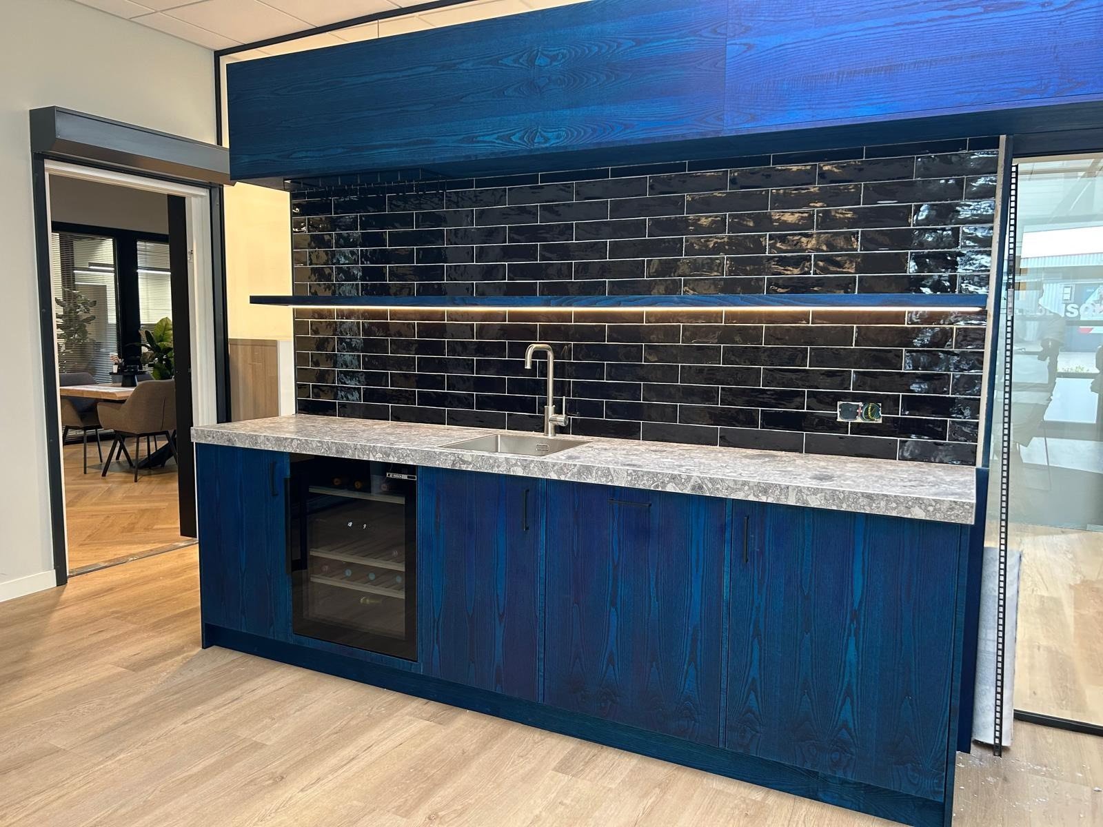 De keuken heeft een frisse blauwe kleur en een praktische indeling, waardoor de ruimte direct een moderne uitstraling krijgt. Alles is netjes afgewerkt en precies gemaakt zoals de klant het wilde.