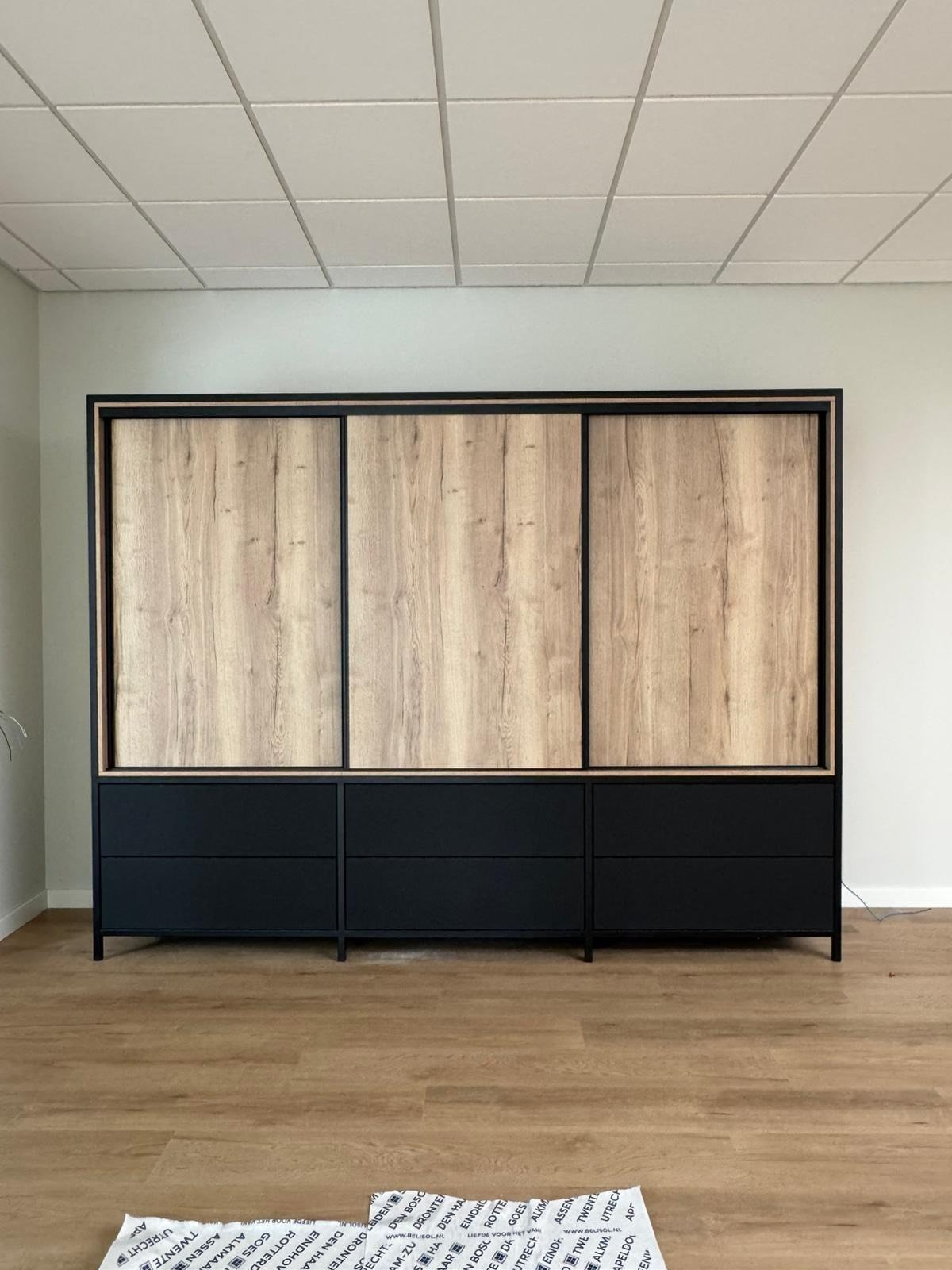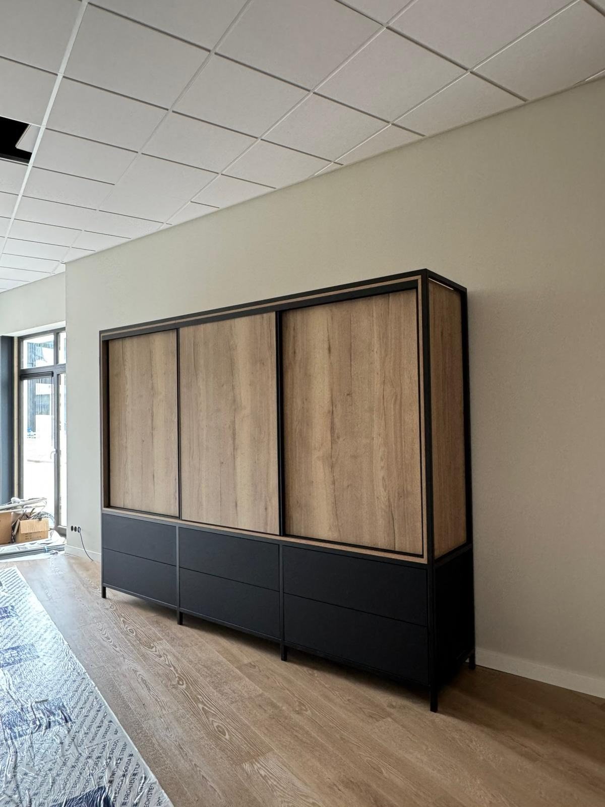 Voor dit project hebben we een moderne kast en een blauwe keuken op maat gemaakt. De kast is strak, rustig en biedt veel opbergruimte.