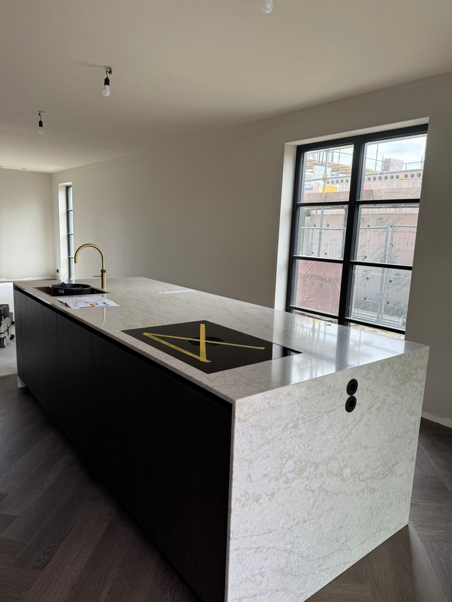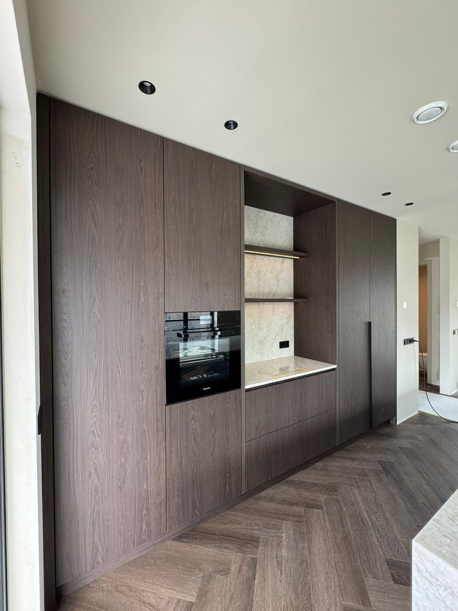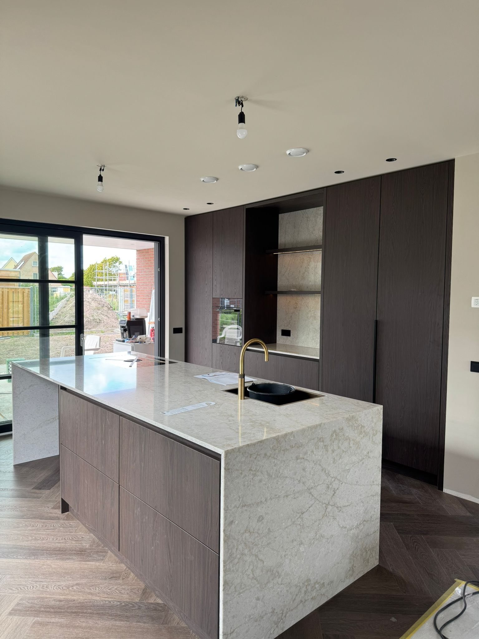 Het kookeiland is het middelpunt van de ruimte en zorgt voor extra kastruimte en een fijne plek om te koken of samen te zitten. Alles is op maat gemaakt en netjes afgewerkt voor een moderne en frisse look.